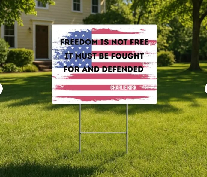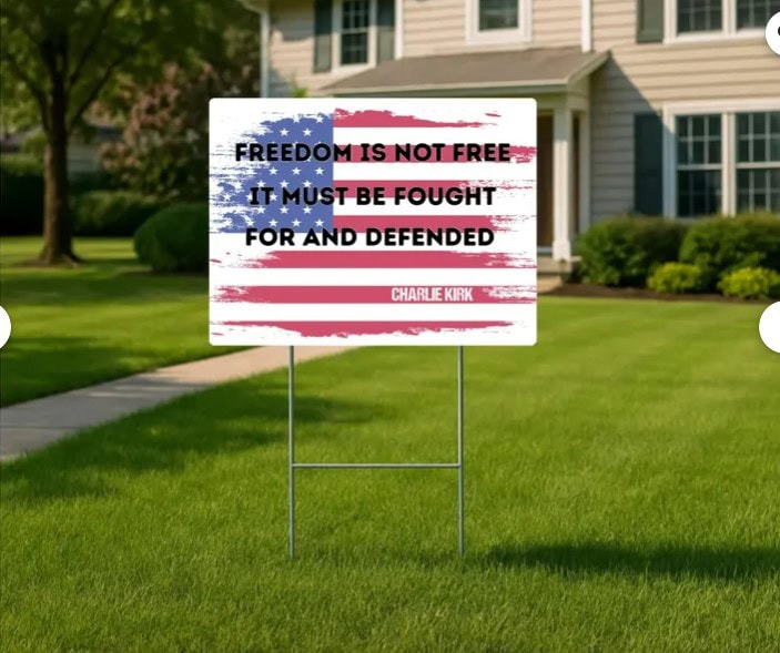 Make a powerful statement of patriotism with the Charlie Kirk Freedom Is Not Free sign. Perfect for memorials, rallies, community events, or everyday display in your yard or garden, this sign reminds us of the true cost of freedom while honoring Charlie Kirk’s legacy.