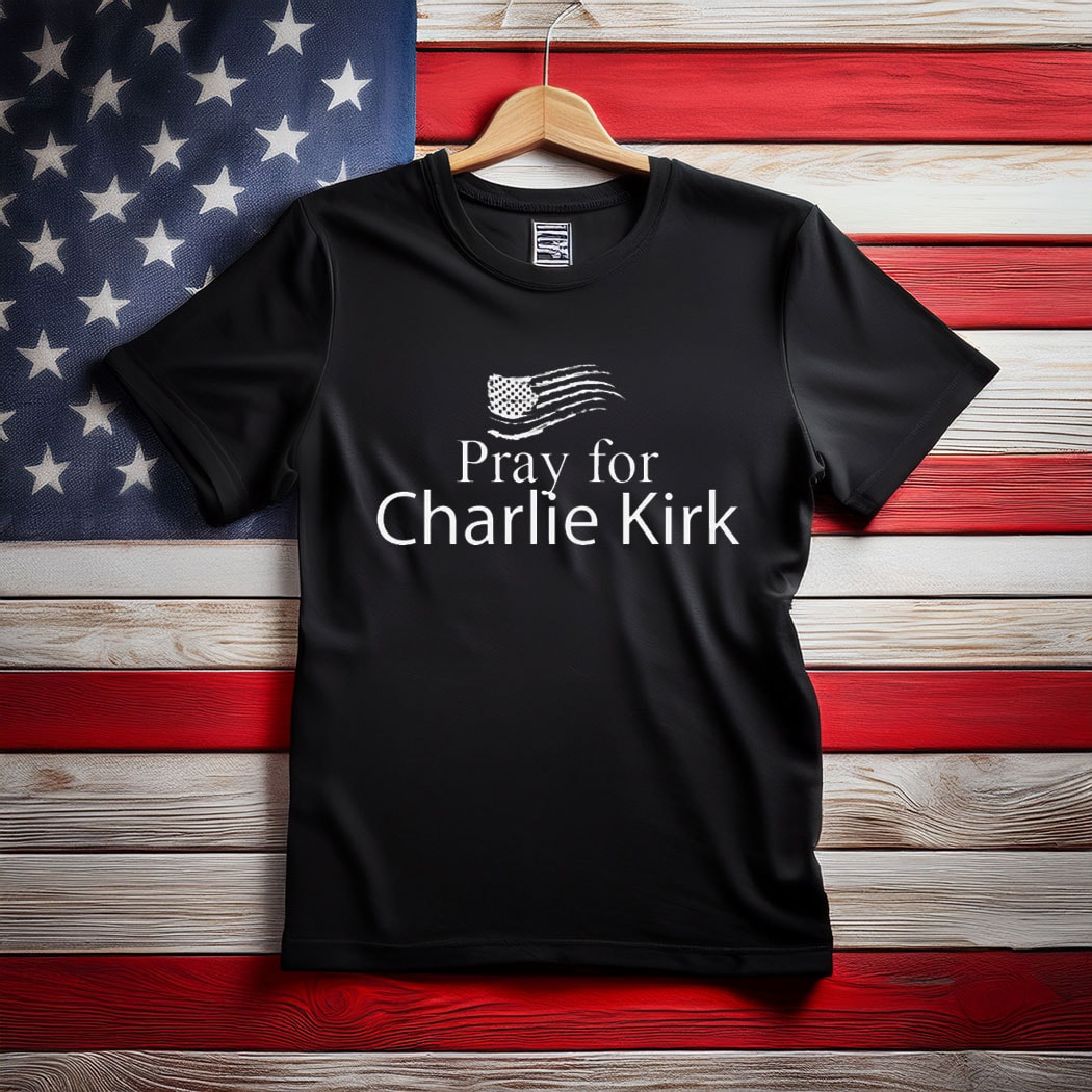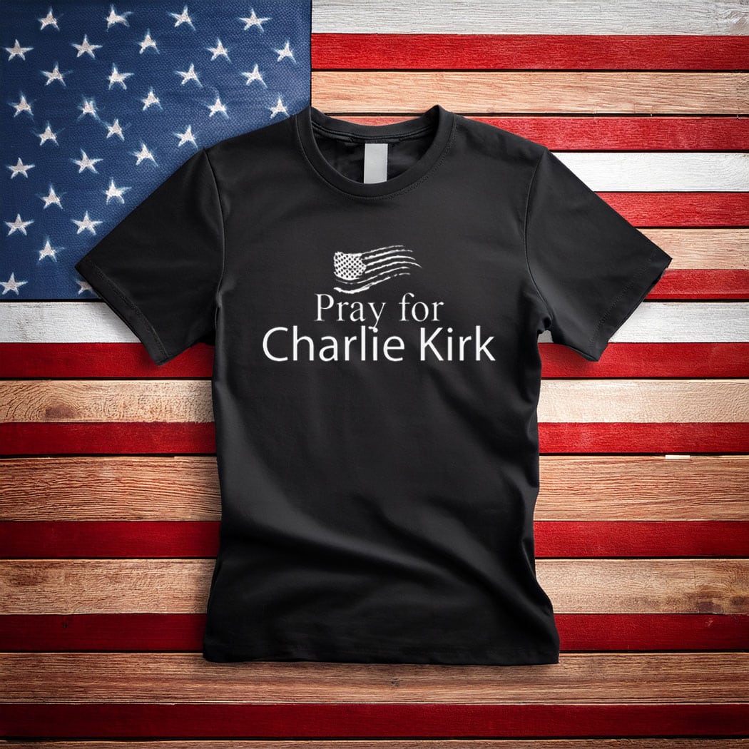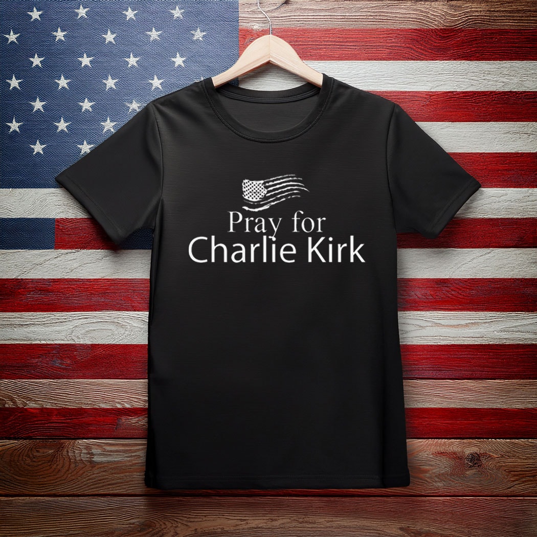 Faith and patriotism-inspired design featuring “Pray for Charlie Kirk – A True Patriot”